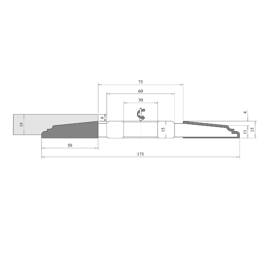 Freză pentru tăblii 175x15x63x30 mm Z3 L (stânga, de jos) CMS proiectată pentru prelucrarea lemnului natural, MDF și alte materiale lemnoase, plasticului, pentru frezarea tăbliilor și a panourilor la uşi de mobilier, uşi de exterior, uşi de interior, pentru structurile cu rame. Freză cu alezaj, cap de frezare profesional pentru mașini de frezat lemn, pentru tâmplărie, cu cuțite din carbură metalică (tungsten, vidia) și profil curbat complex.