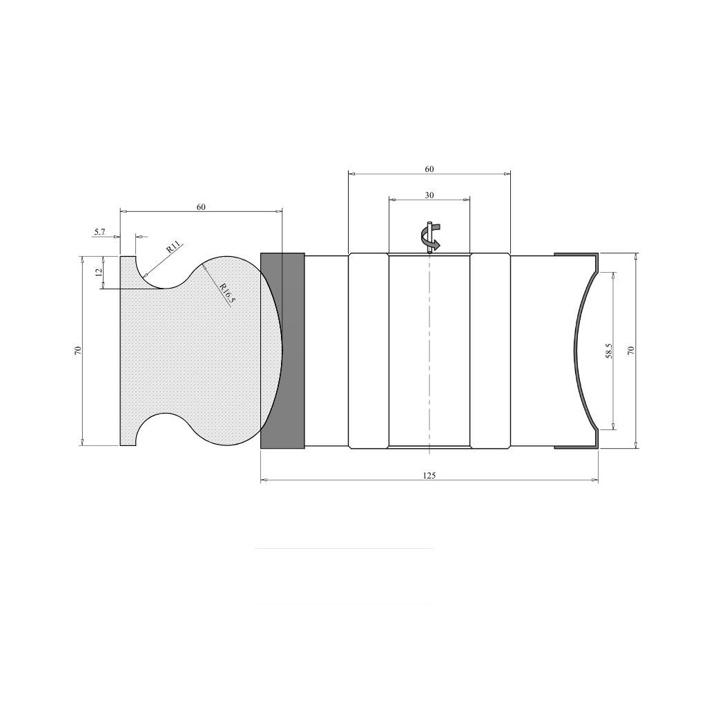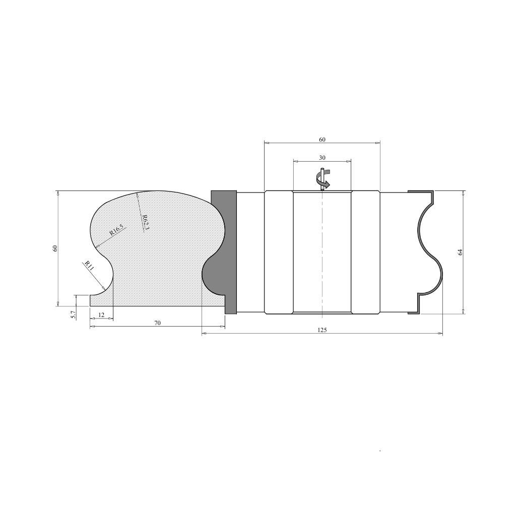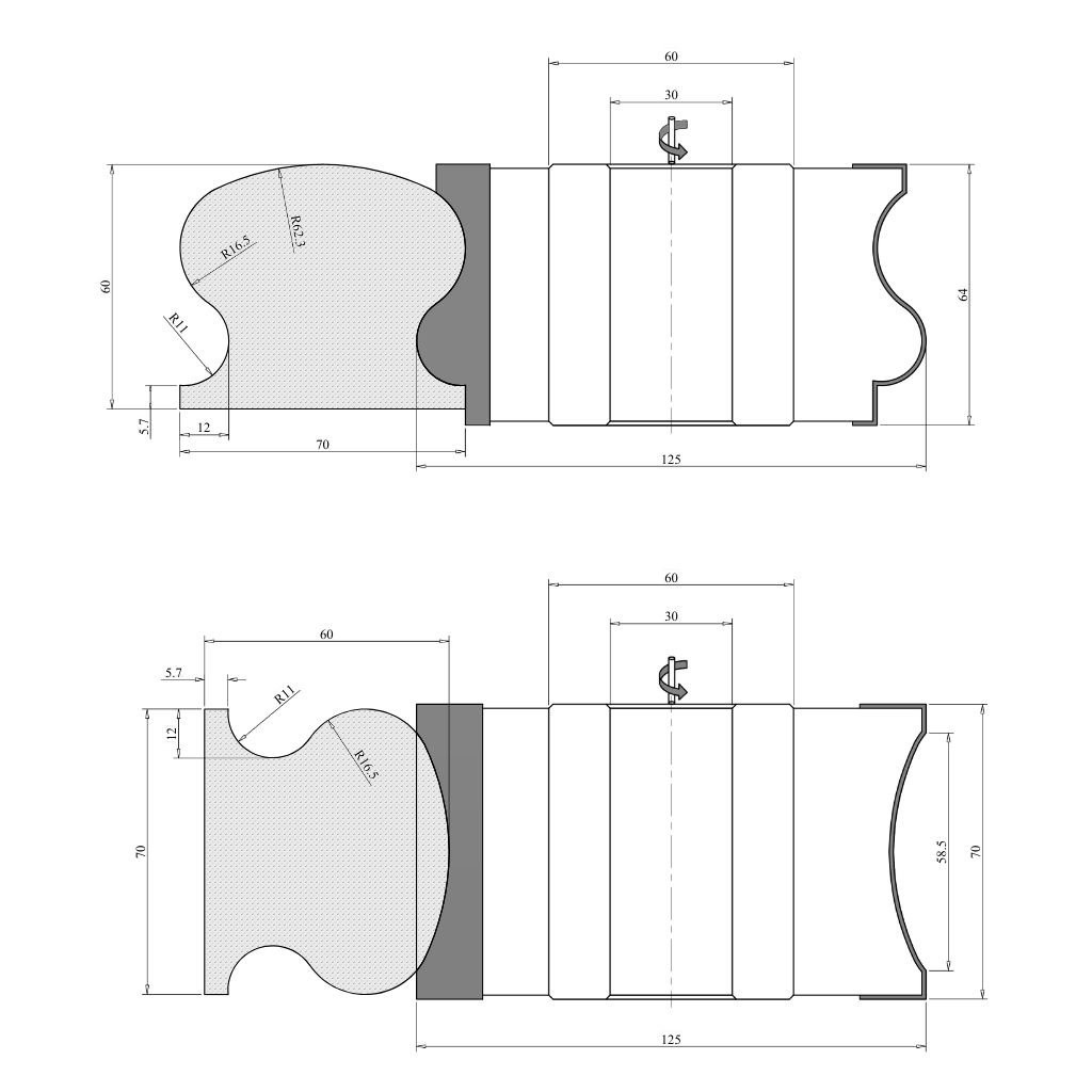 Set de freze pentru mână curentă cu diametrul de 125 mm, grosimea de 68 mm și 62 mm, 3 cuțite, HM HW, cu placuţe brazate, cu alezajul frezei de 30 mm. Capete freza lemn Woodmaster de calitate industrială, pentru mașini de frezat lemn, cu cuțite Tigra Germany din carbură metalică.
